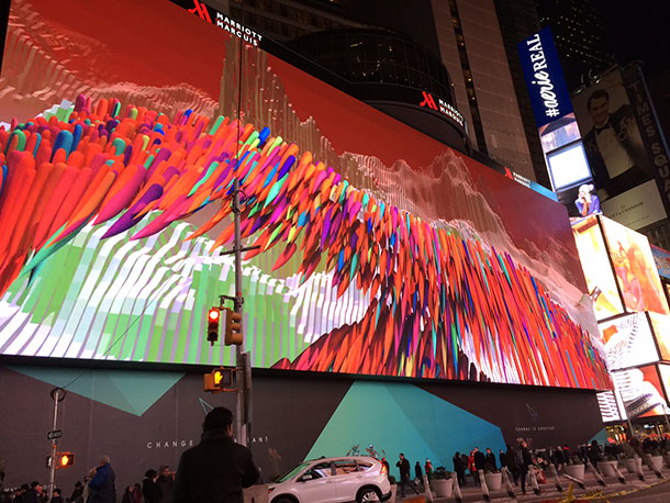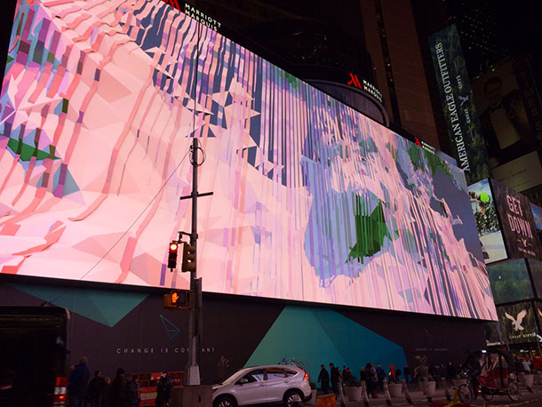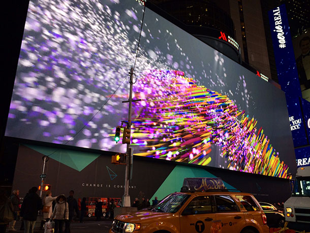 A maior tela digital de alta definição do mundo foi inaugurada semana passada e ocupa um quarteirão inteiro, entre as ruas 45 e 46. Os números são impressionantes: 24 milhões de lâmpadas LED, 100 metros de comprimento e 24 metros de altura, o equivalente a um prédio de 8 andares.