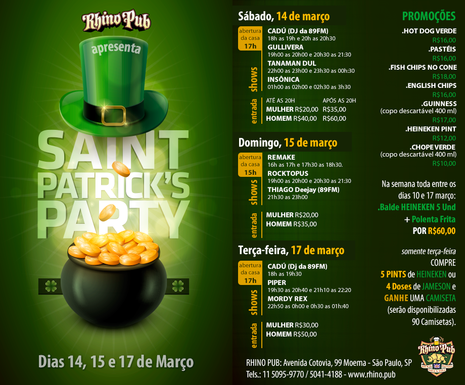 Confira a programação das comemorações do St. Patrick´s Day no Rhino Pub:
