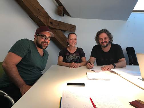 Da esquerda pra direita Björn Meyer, Theresa Voppichler da Odyssey Music Network e LF Vieira, guitarrista do Republica na sede da gravadora em Berlin, na Alemanha no momento da assinatura do contrato dia 26/07/2017