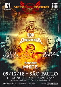 Devido ao sucesso da primeira edição (em 2015), o projeto Metal Singers está de volta, dessa vez com os remanescentes, Udo Dirkschneider (U.D.O., ex-Accept), Blaze Bayley (ex-Iron Maiden) e dois novos participantes; André Matos (Shaman, Viper e ex-Angra) e Doogie White (Michael Schenker’s Temple Of Rock, ex-Rainbow, ex-Tank, ex-Pink Cream 69, ex-Yngwie Malmsteen, etc…). Em São Paulo, o show acontece no dia 09/12/18 (domingo), no Espaço 555 (Av. São João, 555, Centro, São Paulo).