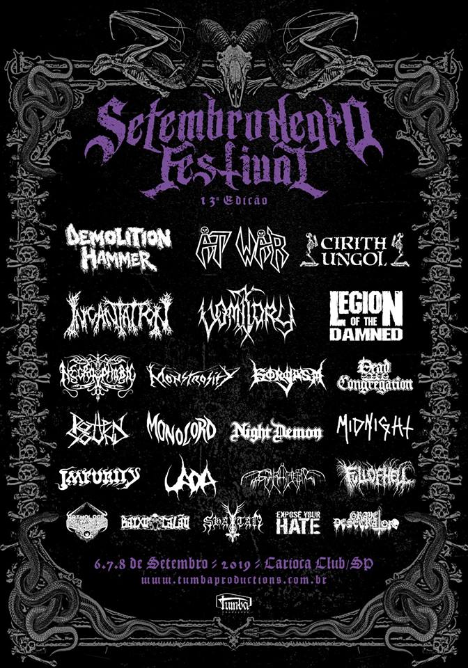 Depois de retornar com duas datas na última edição, o Setembro Negro 2019 terá mais um dia, totalizando 3 dias de evento, com 23 bandas de gêneros como Death, Thrash, Black, Doom, GrindCore, Stoner e Heavy Metal.