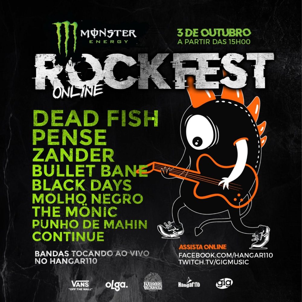 Dead Fish, Pense, Zander, Bullet Bane, Black Days, Molho Negro, The Mönic, Punho de Mahin e Continue são as bandas escaladas para o festival Monster RockFest Online, que terá transmissão ao vivo e gratuita pelo facebook do Hangar110, a partir das 15h, no dia 3 de outubro (sábado).