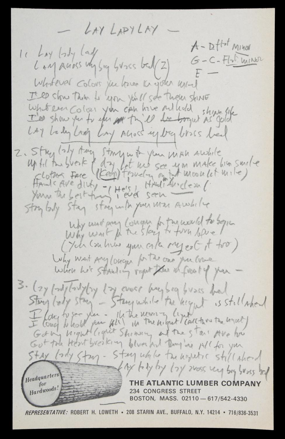 A letra manuscrita do clássico “Lay Lady Lay”, de Bob Dylan, está entre os itens raros que estarão em um badalado leilão que será realizado no mês que vem pela Julien’s Auctions.