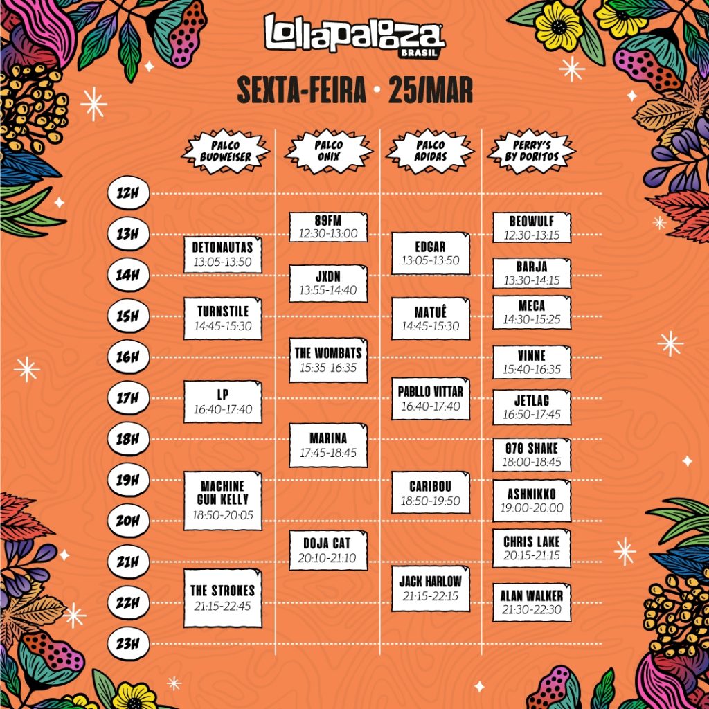 O Lollapalooza Brasil 2022 chegou e movimenta a capital paulista nesta sexta-feira (25), no sábado (26) e no domingo (27). Entre as atrações mais comentadas desta edição estão nomes como Foo Fighters, The Strokes, Miley Cyrus, Black Pumas, IDLES, A Day To Remember, Turnstile, Machine Gun Kelly, The Wombats, Alexisonfire e muito mais (veja abaixo programação completa e horário dos shows). São cerca de 70 atrações e mais de 68 horas de música.