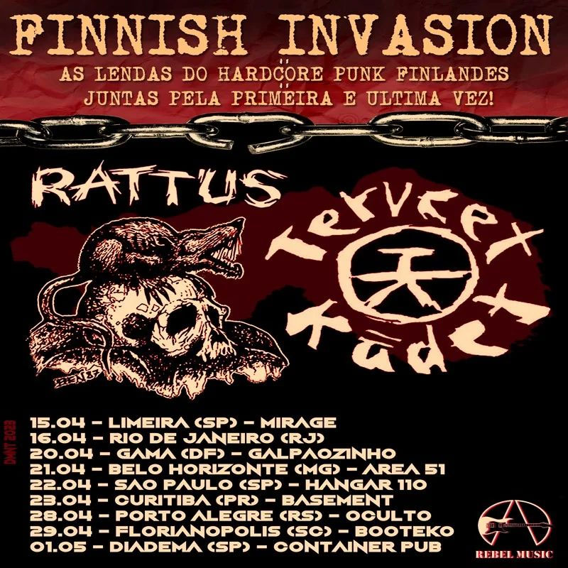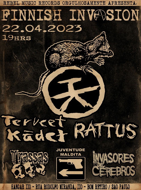 Já o Rattus, é uma das mais antigas e conhecidas bandas de Hardcore/Punk finlandês, que foi formado em 1978, em Vilppula. Aqui no Brasil a banda é bastante conhecida, graças ao disco Uskonto On Vaara (1984), que teve sua edição em vinil, lançada por aqui. Eles deram uma pausa em 1988 e retornaram só em 2001. Será a quarta e última passagem da banda pelo Brasil, já que encerrará suas atividades, e escolheu o Brasil como o lugar para fazer sua turnê de despedida. O Ratos de Porão fez um cover de Rattus, da faixa “Rajoitettu Ydinsota”, lançada no disco Feijoada Acidente – Internacional, em 1995.