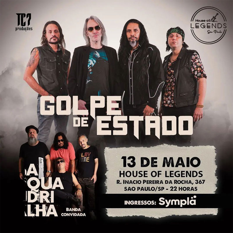 Neste sábado (13) o Golpe de Estado se apresentará na House Of Legends (R. Inácio Pereira da Rocha, 367, Pinheiro, São Paulo), a partir das 22h. A banda A Quadrilha é a convidada para abrir esse espetáculo. Para comprar ingressos, acesse AQUI.