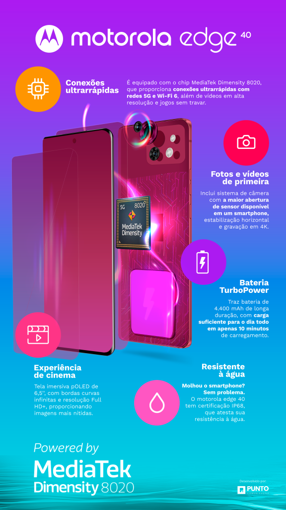 O “cérebro” do motorola edge 40 é o chipset MediaTek Dimensity 8020, que proporciona conexões perfeitas ultrarrápidas com redes 5G e Wi-Fi, garantindo vídeos de alta resolução e jogos sem travar. Para quem ainda não sabe, a MediaTek é simplesmente a líder no mercado mundial de chips para smartphones, além de liderar setores como os de processadores para smart TVs e assistentes pessoais inteligentes, entre outros.