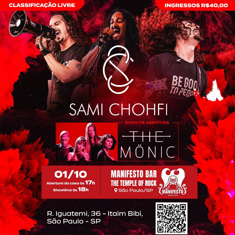 O músico Sami Chohfi, conhecido por suas poderosas performances no palco e sua mistura única de rock alternativo, folk e composições acústicas, está de volta ao Brasil e retorna à São Paulo para uma apresentação única. O show acontecerá no Manifesto Bar (R. Iguatemi, 36 – Itaim Bibi) no dia 01 de outubro, local onde o músico já se apresentou há alguns anos com sua antiga banda, Blue Helix. O show de abertura ficará a cargo da banda paulista The Monic e os ingressos já estão à venda pelo site Bilheto.Com.Br. Além da capital paulista, Sami também se apresentou no último sábado (16) no Festival Rock in Lago, na cidade de Jacutinga (MG), que trouxe no line-up artistas consagrados do rock nacional como Plebe Rude, Biquíni (ex-Biquini Cavadão), e Paulo Ricardo.