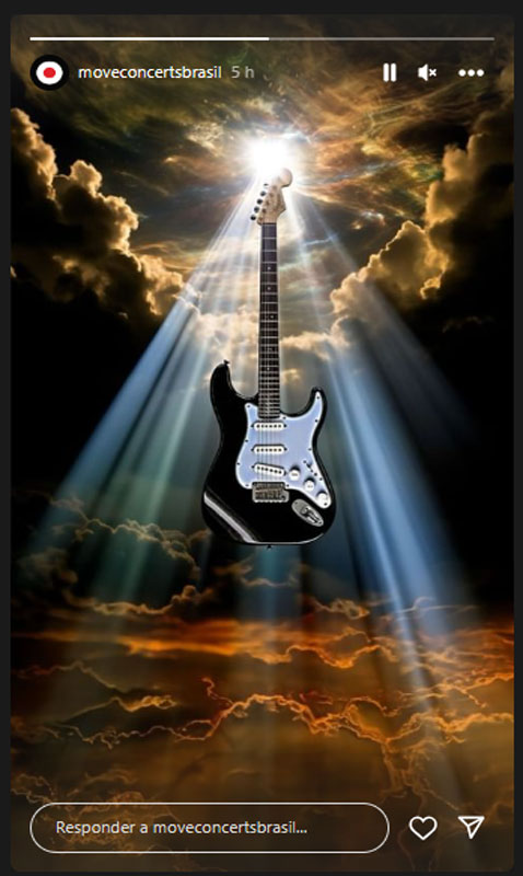 A imagem de uma guitarra iluminada ao fundo por um céu épico sugere o anúncio, em breve, de algum artista lendário relacionado ao rock and roll.