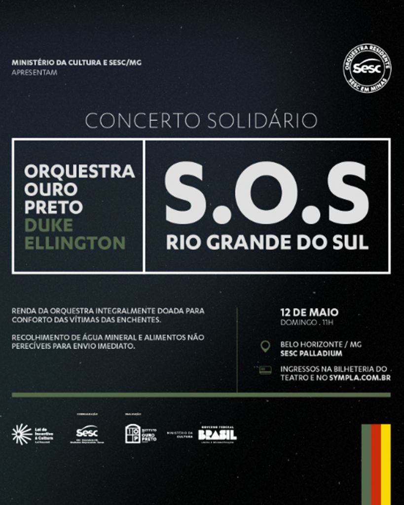 Em solidariedade às vítimas da tragédia ambiental no Rio Grande do Sul, a Orquestra Ouro Preto irá destinar a renda arrecadada com o concerto em homenagem a Duke Ellington, que será apresentado no Dia das Mães, 12 de maio, às 11h, no Sesc Palladium, em Belo Horizonte-MG, para ações solidárias na região afetada.