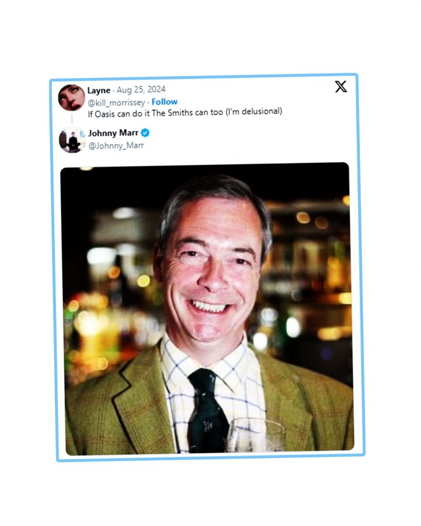 Como resposta, Marr postou uma foto de Nigel Farage com uma cerveja na mão. Farage é um político britânico conservador adorado por Morrissey.