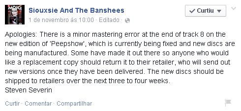 Segundo o baixista do Siouxsie and the Banshees, Steven Severin, em até três semanas um novo disco deverá ser entregue aos compradores do álbum defeituoso.