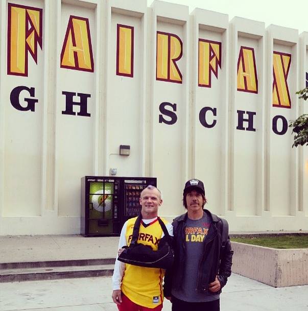 Nesta terça (17), o vocalista Anthony Kiedis e o baixista Flea, do Red Hot Chili Peppers, marcaram presença no colégio de Fairfax, em Los Angeles.