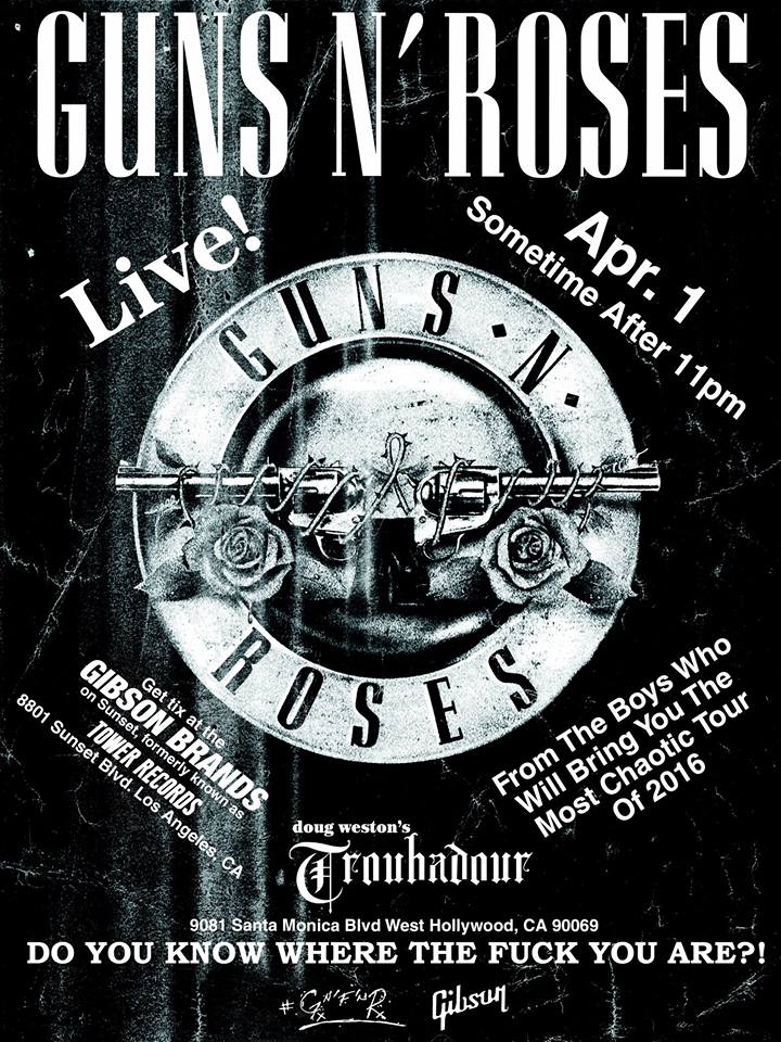 O aguardado “show surpresa” que o Guns N´Roses faria hoje em Los Angeles vai mesmo acontecer, pelo menos é o que indica a banda em uma postagem em sua página no Facebook.