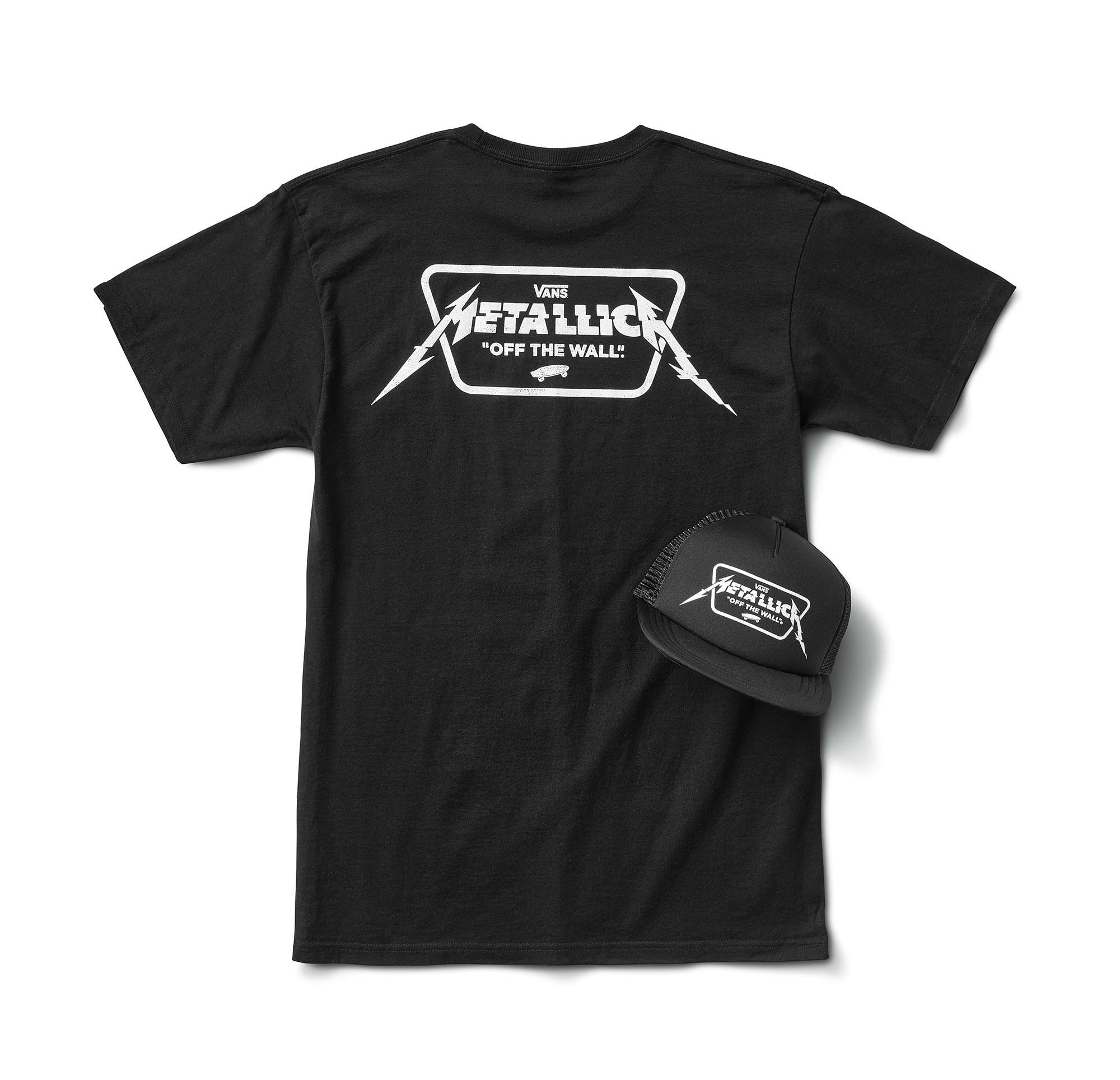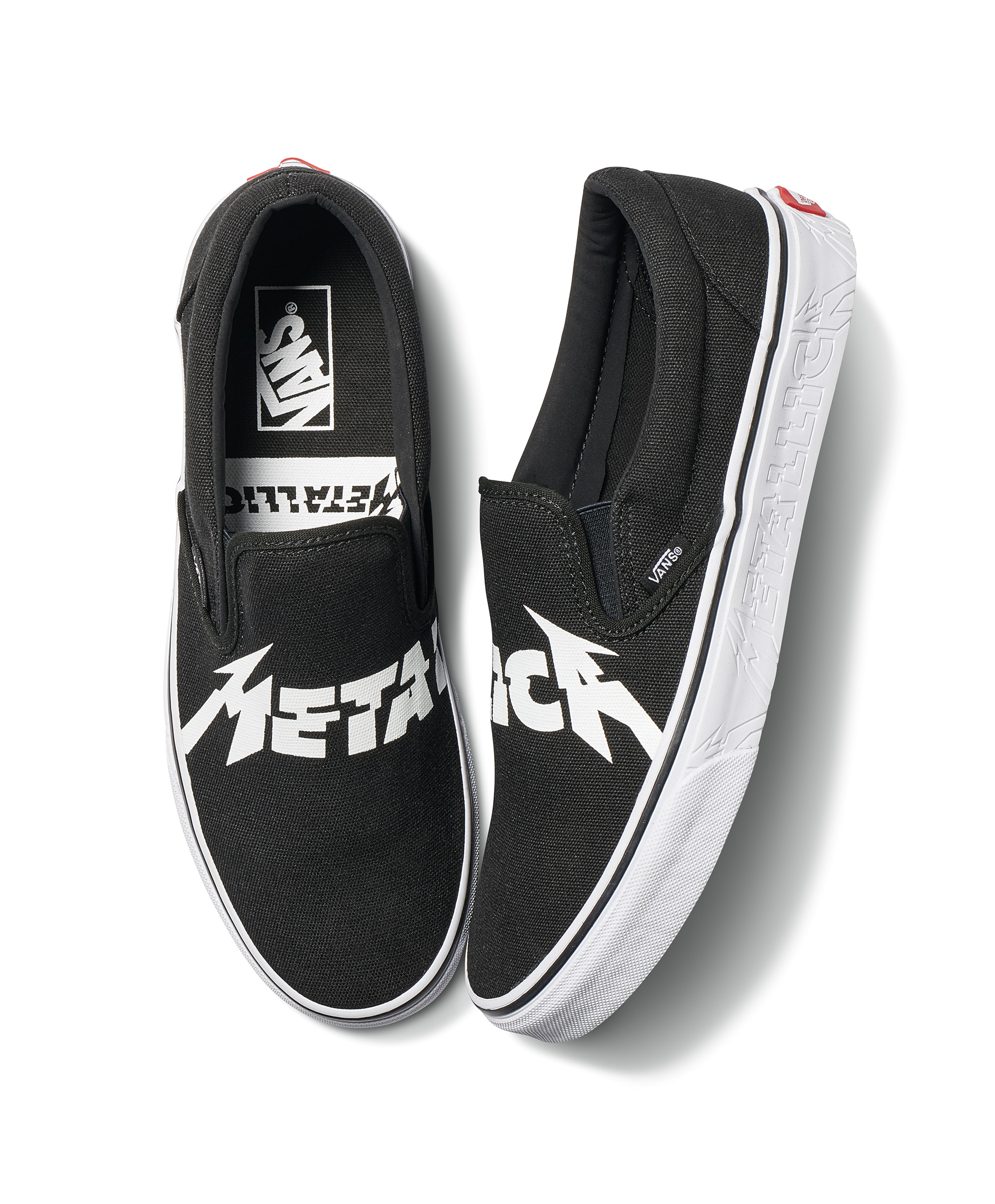 O Classic Slip-On da coleção destaca uma estampa do logo do Metallica e é completo com a inscrição gravada com o nome da banda na sola. Uma camiseta e um boné trucker fecham o pack, apresentando o logo Vans x Metallica reinventado.