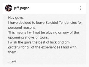 O guitarrista Jeff Pogan usou sua conta no Instagram para informar aos fãs que está de saída do Suicidal Tendencies. No seu texto na rede social, diz que resolveu cair fora por motivos pessoais.