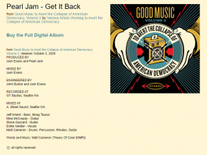 No entanto, o grande destaque fica com o Pearl Jam, que liberou uma faixa nunca lançada chamada “Get It Back” para esta coletânea. Segundo aponta o painel GoodMusic2020 da Bandcamp, essa é uma nova gravação realizada pela banda em Seattle com a produção de Josh Evans, que assina seu mais recente álbum, Gigaton.