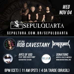 Na SepulQuarta desta semana, nesta quarta-feira (04), o Sepultura dá as boas-vindas a Rob Cavestany, guitarrista da banda de thrash metal Death Angel. Além do perguntas e respostas com a banda, o músico se junta ao grupo brasileiro para uma versão Live Quarentine de “Apes of God” do álbum Roorback (2003). A transmissão on-line está marcada para começar às 16h, no YouTube (AQUI).