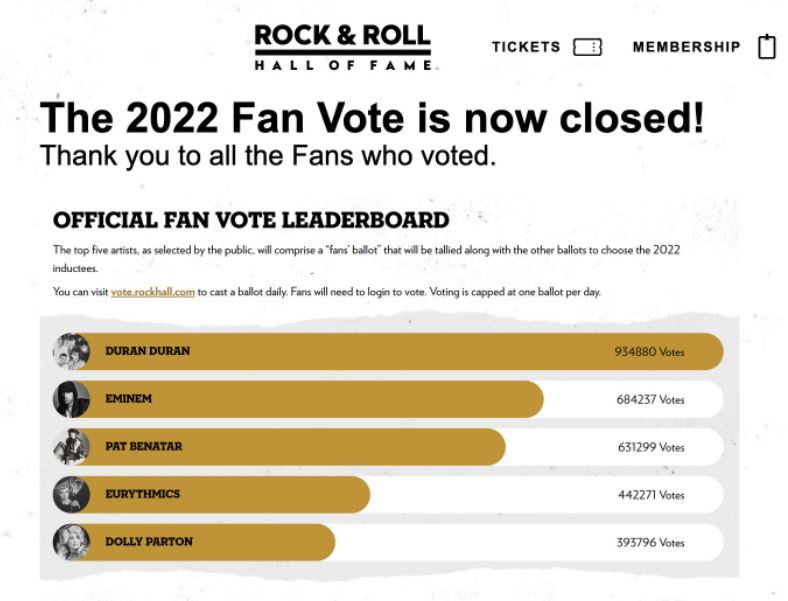 A votação popular no site do Hall da Fama do Rock And Roll foi encerrada agora há pouco e Parton ficou em quinto lugar. O Duran Duran foi o mais votado com 934.880 votos, seguido por Eminem com 684.237 votos e Pat Benatar com 631.299 votos. O Eurythmics descolou a quarta posição com 442.271, enquanto que Parton registrou 393.796, tirando o Judas Priest do Top 5.