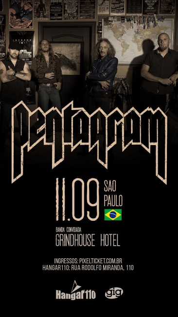 A clássica banda de heavy doom norte-americana Pentagram, na ativa desde 1971, chega a São Paulo neste domingo para um inédito show no Hangar 110. A banda de abertura é a paulistana de stoner/grunge Grindhouse Hotel, que em breve fará uma série de lançamentos pelo selo Abraxas Records.