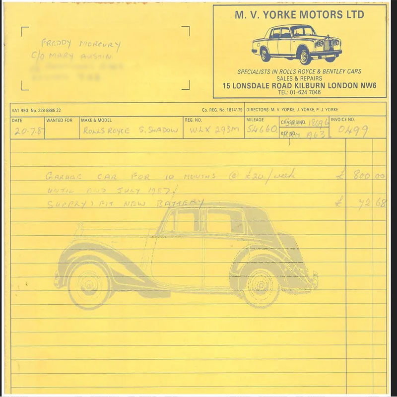 O site da Sotheby’s traz diversas fotos com detalhes do veículo, inclusive a nota fiscal da MV Yorke Motors de Londres com o nome de Freddie. A NF a gente reproduziu aqui embaixo e as demais fotos você pode conferir AQUI. O músico comprou o Rolls Royce em 1979 e o possuiu até sua morte, em 1991. O veículo foi herdado por sua irmã Kashmira Bulsara que o vendeu para Serdyuchka em 2013.