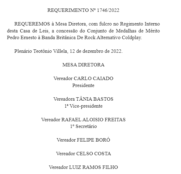 A Câmara dos Vereadores do Rio de Janeiro propôs entregar a medalha de mérito Pedro Ernesto à banda britânica Coldplay. Segundo apurou o jornal O Globo, o requerimento feito pela Mesa Diretora foi publicado nesta quarta-feira (14) no Diário Oficial e ainda será votado.