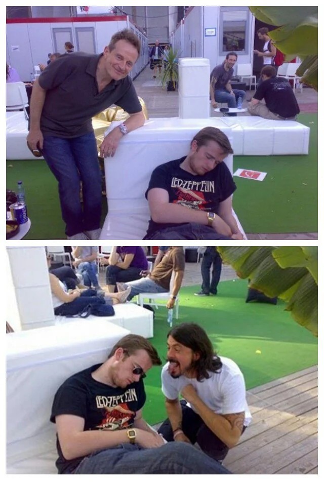 Você passou a vida toda ouvindo Led Zeppelin e num certo dia é convidado para conhecer John Paul Jones, baixista da banda. Você ganhou ingressos para ver Them Crooked Vultures, projeto musical que além de Jones conta com Dave Grohl do Foo Fighters e Josh Homme do Queens Of The Stone Age. Você veste sua camiseta favorita do Led, chega cedinho ao show, em certo momento é conduzido aos bastidores e recebe a orientação para aguardar o Meet & Greet, aquele momento em que os artistas encontram os fãs para trocar uma ou outra palavra, dar um aperto de mãos e tirar uma foto pra você mostrar para os amigos. Como a expectativa de encontrar com seu herói é grande, você resolve beber um pouco mais. E mais um pouco. E talvez um pouquinho a mais do que você está acostumado a beber. E o resultado? Você desaba bebaço num canto da sala de espera. Você perde a oportunidade de conhecer pessoalmente seu grande ídolo. Mas seu grande ídolo é um cara muito profissional. Alguém disse pra ele que você participaria do encontro e o cara não deixa você ir embora sem uma foto. Ele faz uma pose com você lá desabado naquele canto. Foi exatamente isso o que rolou com, Sam Doyle, baterista da banda The Maccabees, que em 2010 foi a um show do Them Crooked Vultures para conhecer John Paul Jones e não deu conta de esperar sóbrio pelo encontro. Jones tirou uma foto com ele. E Dave Grohl também fez questão de fazer uma pose com o fã do Led Zeppelin.