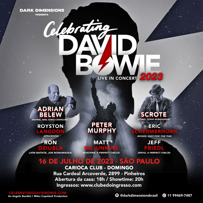 Ao lado de Adrian Belew (guitarra/David Bowie, King Crimson, NIN) e dos renomados músicos Royston Langdon (baixo/Spacehog), Matt McJunkins (baixo/A Perfect Circle), Scrote (guitarra/Sting, Todd Rundgren), Jeff Friedl (bateria/Devo, A Perfect Circle), Ron Dziubla (saxofone/Jon Batiste, Joe Bonamassa) e Eric Schermerhorn (guitarra/David Bowie, Iggy Pop). Peter Murphy apresentará no Carioca Club Pinheiros, em São Paulo, dia 16 de julho, interpretações dos maiores sucessos de David Bowie com ênfase especial na sua era proto-punk de Ziggy Stardust, os álbuns da trilogia de Berlim (“Low”, “Heroes” e “Lodger”) e seus últimos anos de parceria com o líder do NIN, Trent Reznor.