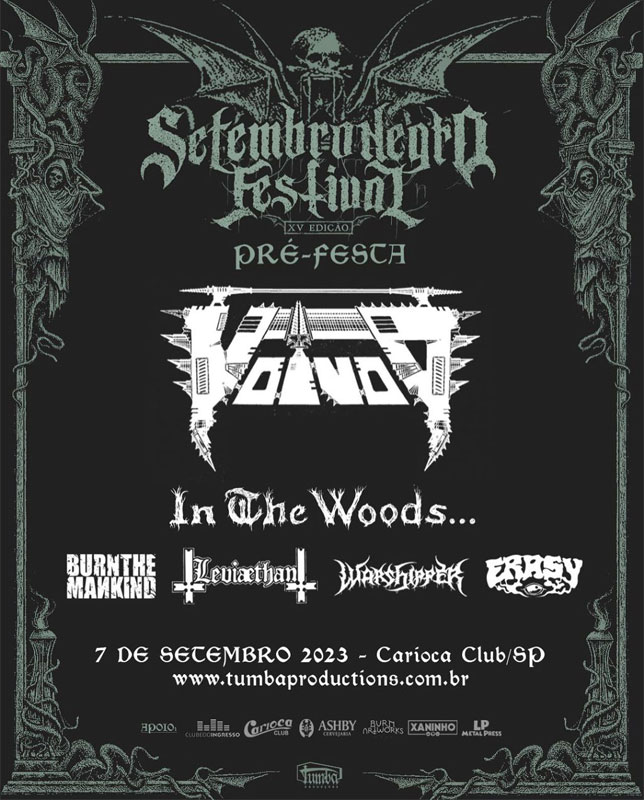Nesta semana acontece a 15ª edição do Festival Setembro Negro no Carioca Clube (R. Cardeal Arcoverde, 2899, Pinheiros, São Paulo). Na quinta (07, feriado nacional), acontece a Pré-festa. As bandas que farão parte da pré-festa, são: Erasy, Burn The Mankind, Warshiper, Leaviaethan, In The Woods… e a banda headliner será o Voivod.