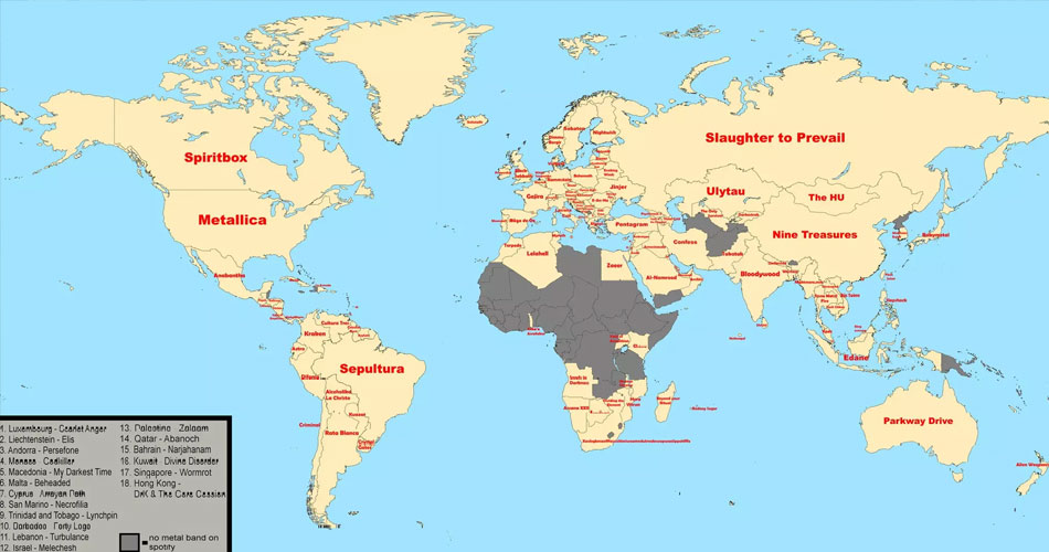 Um usuário do reedit utilizou dados fornecidos pelo Spotify para criar um mapa on-line que mostra a banda nacional de metal mais ouvida em praticamente todos os países do mundo, com base em sua popularidade em 2024.