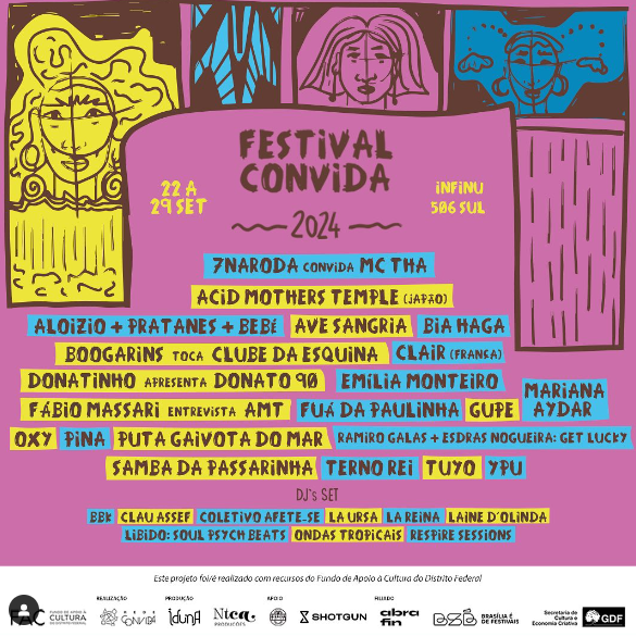 Ingressos: Disponíveis em https://shotgun.live/pt-br/venues/infinu-comunidade-criativa e https://shotgun.live/pt-br/festivals/festival-convida-2024-passaporte